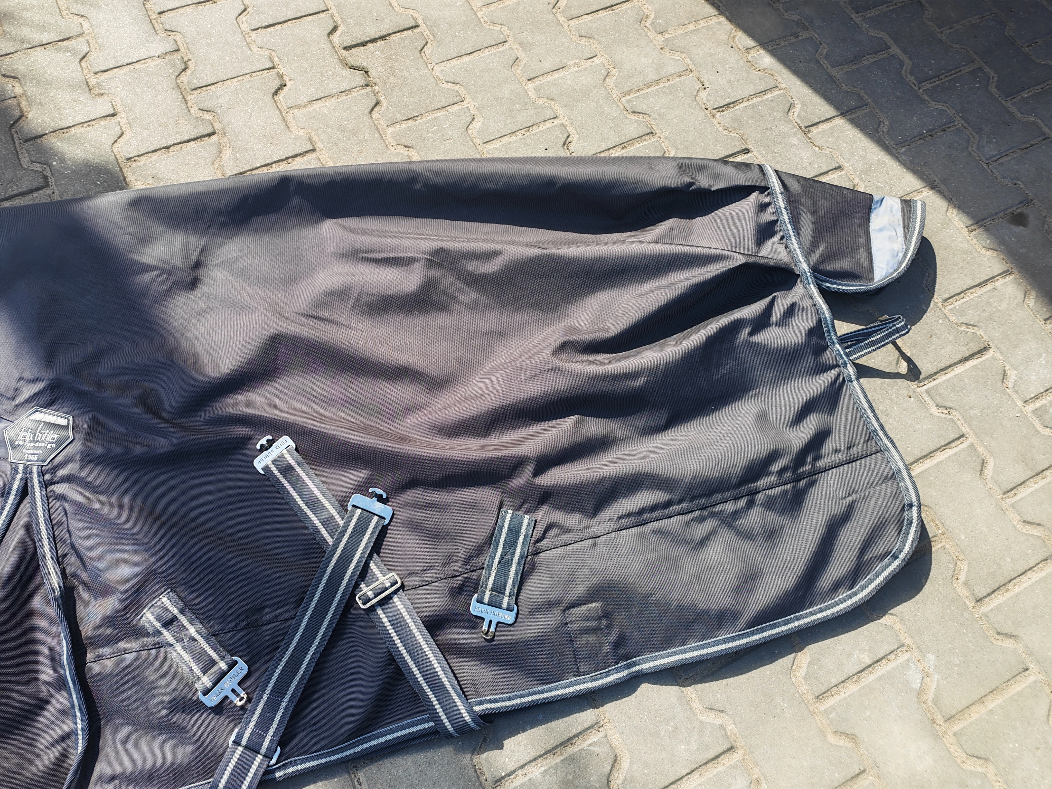 Niezwykle funkcjonalna i wyjątkowo odporna na rozdarcia derka z przedłużonym karkiem, wykonana z nylonu 1680 denierów, o bardzo wysokiej wodoodporności (słup wody 5000 mm) i bardzo dobrej oddychalności. W porównaniu do poliestru nylon jest dużo bardziej miękki, a także ma połysk. Jednocześnie nylon jest wielokrotnie bardziej rozciągliwy niż poliester, co przekłada się na większą odporność na rozdarcie. Elastycznie, rozciągające się wstawki w okolicy ramion/szyi, wykonane z wysoce hydrofobowego materiału softshell, a także duże kliny zapewniają optymalną swobodę ruchów, gwarantują wyjątkowe dopasowanie i zapobiegają powstawaniu klasycznych, niepożądanych punktów ucisku. Wewnętrzne, obszerne wypełnienie na wysokiej szyi, aby dodatkowo zminimalizować nacisk w okolicy kłębu. Zapięcie z przodu z regulacją szerokości i potrójnym wyważeniem, 2 karabińczykami i 2 kółkami oraz dodatkowym, ulepszonym KV. W razie potrzeby karabińczyki można łatwo wymienić. Gładka, przyjazna dla futra podszewka. Regulowane pasy krzyżowe i D ringi umożliwiające opcjonalne zamocowanie pasów na nogi. Regulowany na długość pasek na ogon oraz klapa na ogon z odblaskowymi paskami i odblaskową lamówką dookoła.