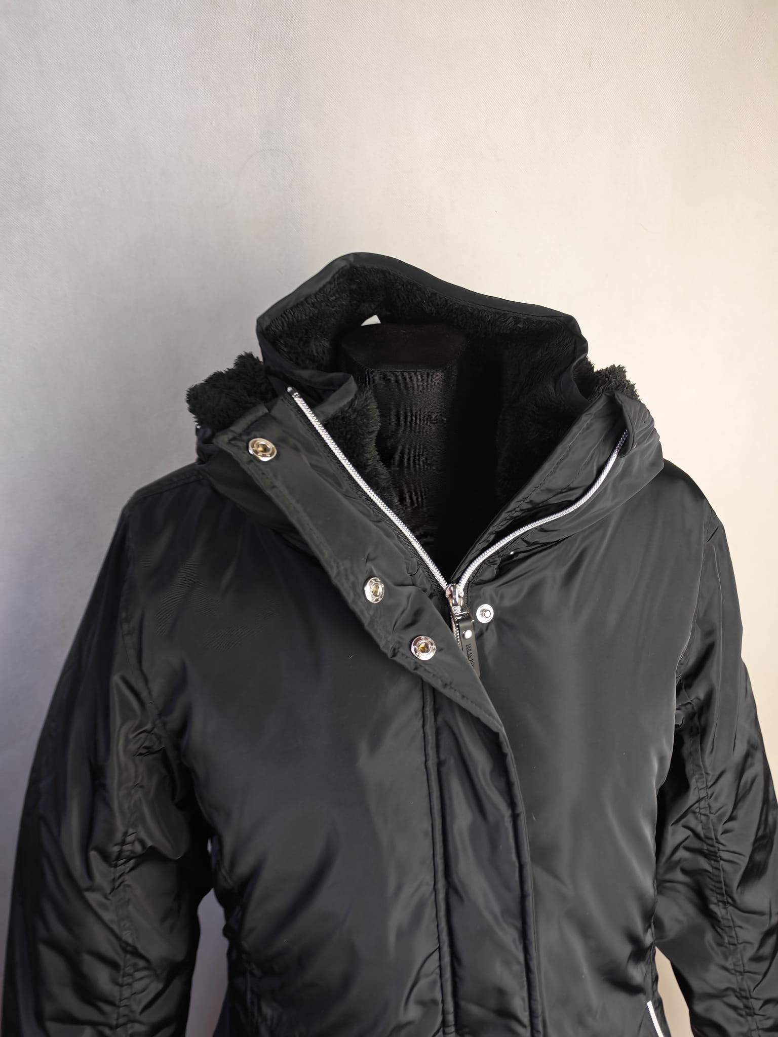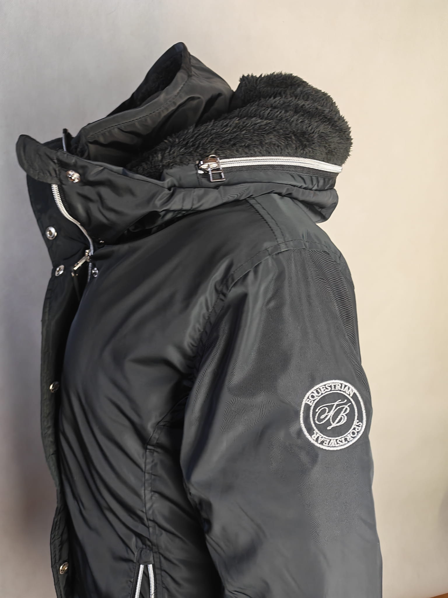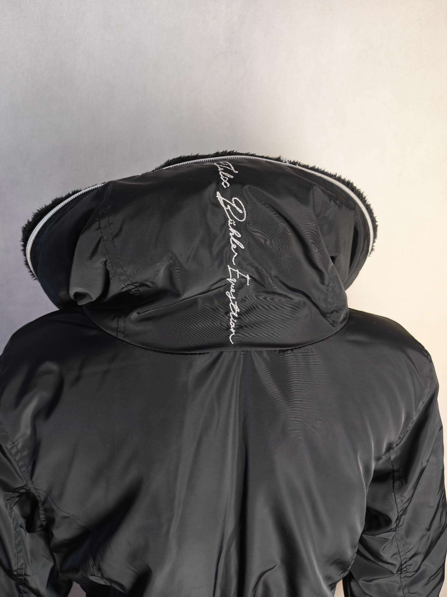 Supermodna, ciepła kurtka jeździecka z bardzo dużym kołnierzem podszytym miękkim polarem typu „teddy” i chowanym kapturem, również podszytym polarem typu „teddy”. Wodoodporna i wiatroszczelna. Ciepłe, miękkie wypełnienie, ukryty dwukierunkowy zamek błyskawiczny z przodu, dwie przednie kieszenie zapinane na zamek, jedna kieszeń wewnętrzna zapinana na zamek, dwa otwory wentylacyjne zapinane na zatrzaski z tyłu, elastyczny pas z tyłu oraz wysokiej jakości haft Felix Bühler na kołnierzu i rękawach. Mankiety rękawów z elastycznymi otworami na kciuki.