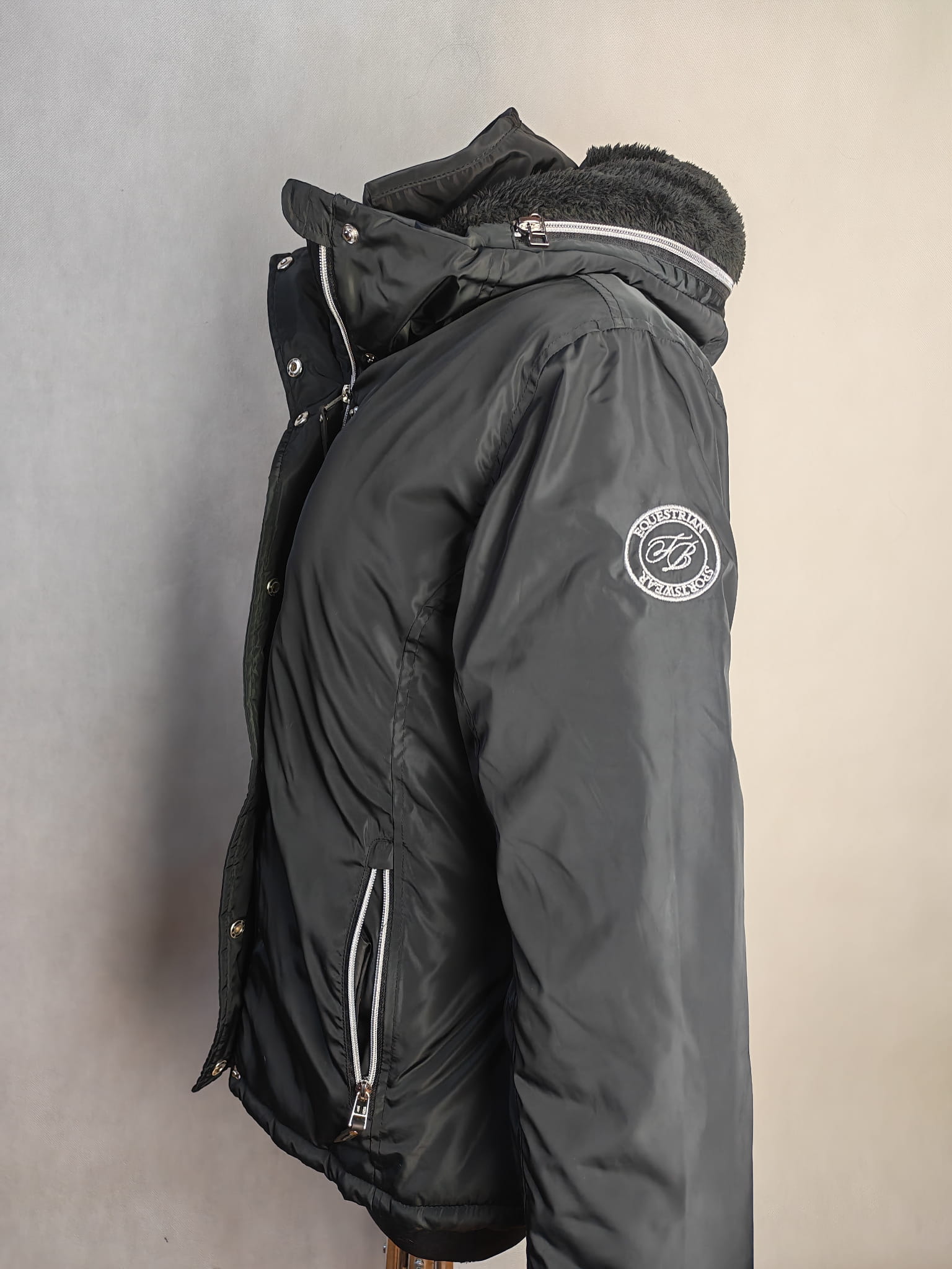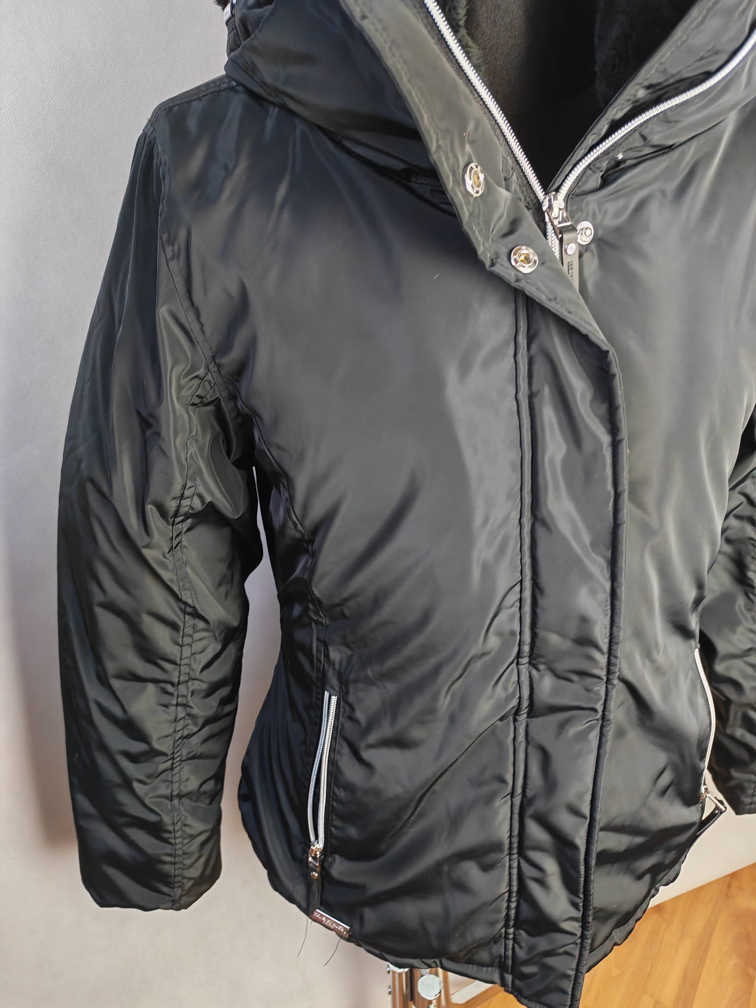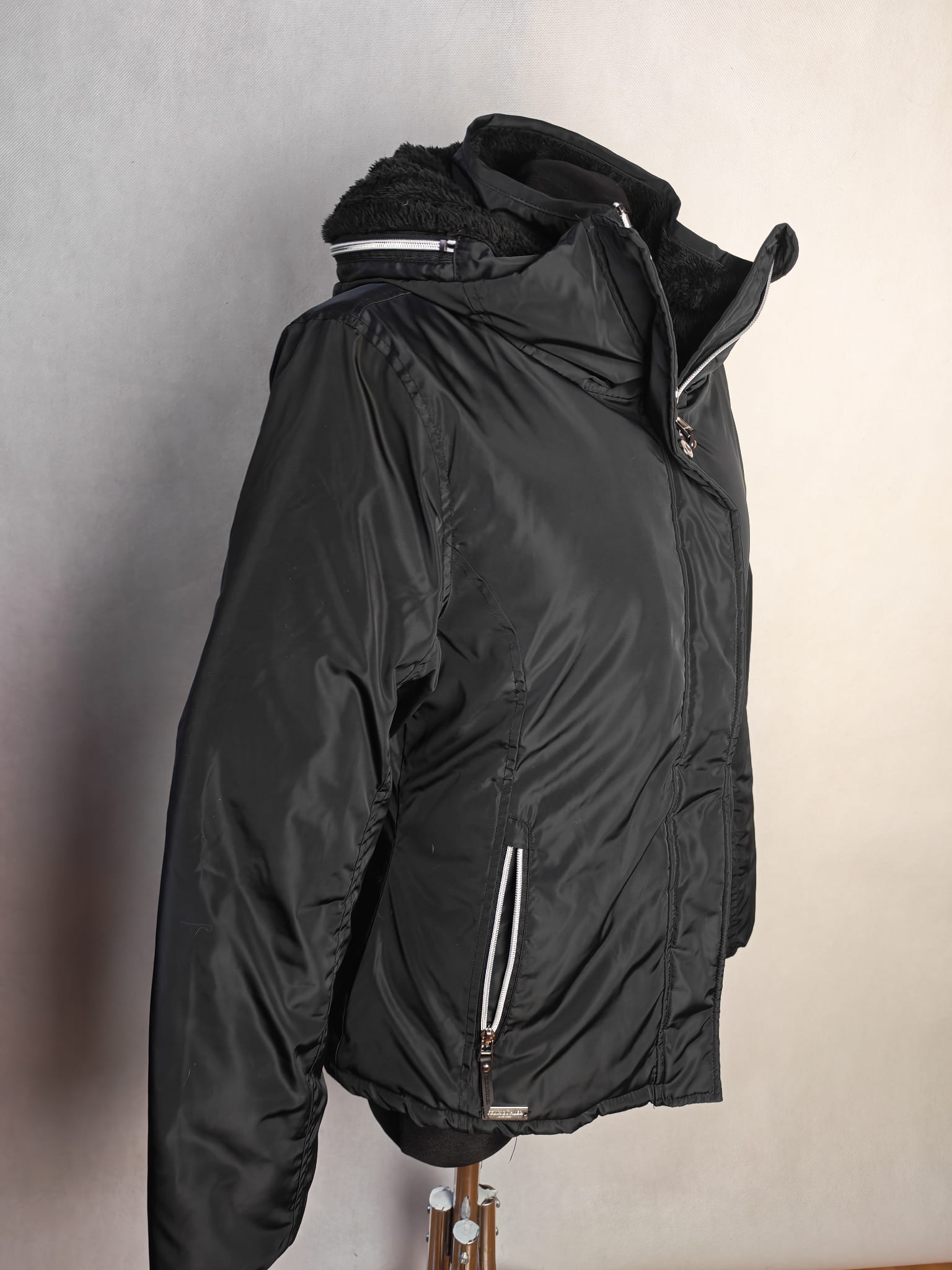 Supermodna, ciepła kurtka jeździecka z bardzo dużym kołnierzem podszytym miękkim polarem typu „teddy” i chowanym kapturem, również podszytym polarem typu „teddy”. Wodoodporna i wiatroszczelna. Ciepłe, miękkie wypełnienie, ukryty dwukierunkowy zamek błyskawiczny z przodu, dwie przednie kieszenie zapinane na zamek, jedna kieszeń wewnętrzna zapinana na zamek, dwa otwory wentylacyjne zapinane na zatrzaski z tyłu, elastyczny pas z tyłu oraz wysokiej jakości haft Felix Bühler na kołnierzu i rękawach. Mankiety rękawów z elastycznymi otworami na kciuki.