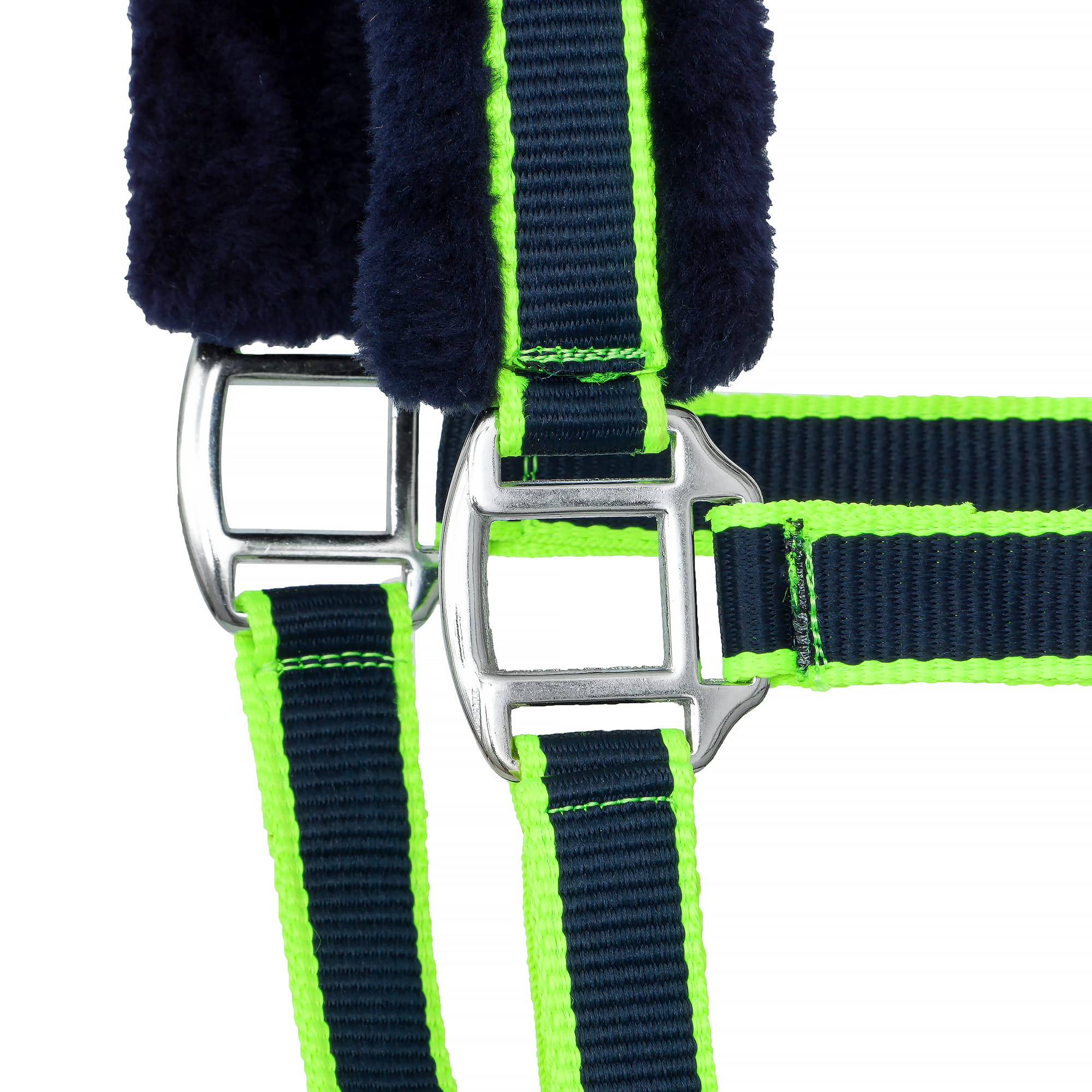 Praktyczny i wygodny kantar dla koni, łączący solidne wykonanie z atrakcyjnym wzornictwem. Wykonany z wytrzymałego nylonowego paska w kolorze granatowym z neonowozielonymi akcentami, co nadaje mu nowoczesny wygląd i poprawia widoczność.
