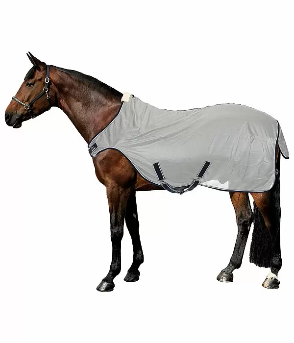 Lekka derka dla koni wrażliwych na muchy, wykonana z oddychającej siateczki, idealna do karuzeli lub spacerów. Szerokie wycięcie na ramiona zapewnia maksymalną swobodę ruchów. Proste zapięcie z przodu w kształcie litery T i dodatkowe zapięcie na rzepy zapewniają bezpieczne dopasowanie. Gładka, przyjazna dla futra podszewka w okolicy klatki piersiowej i ogona posiada miękkie, pluszowe futerko z polaru na kłębie.