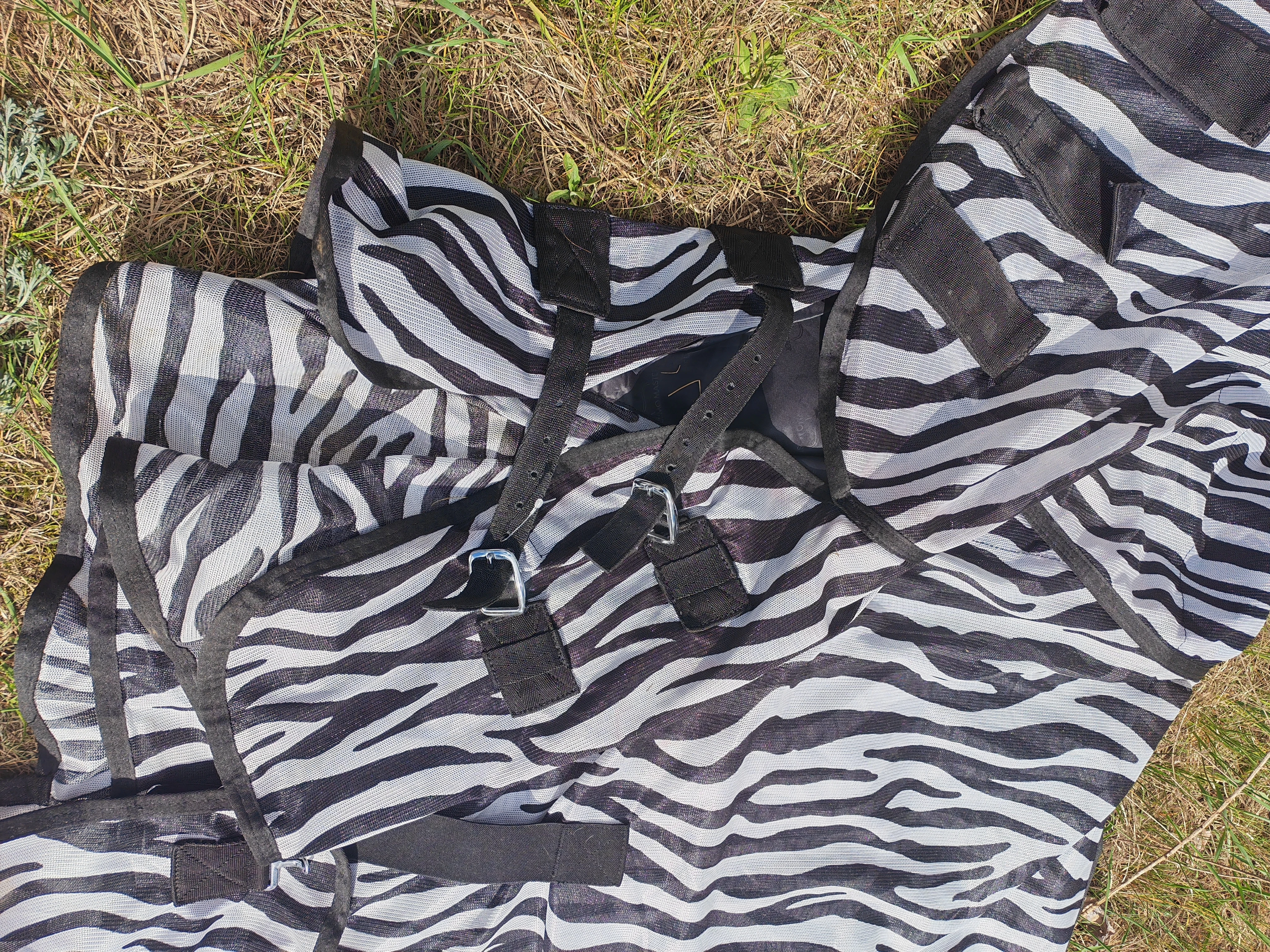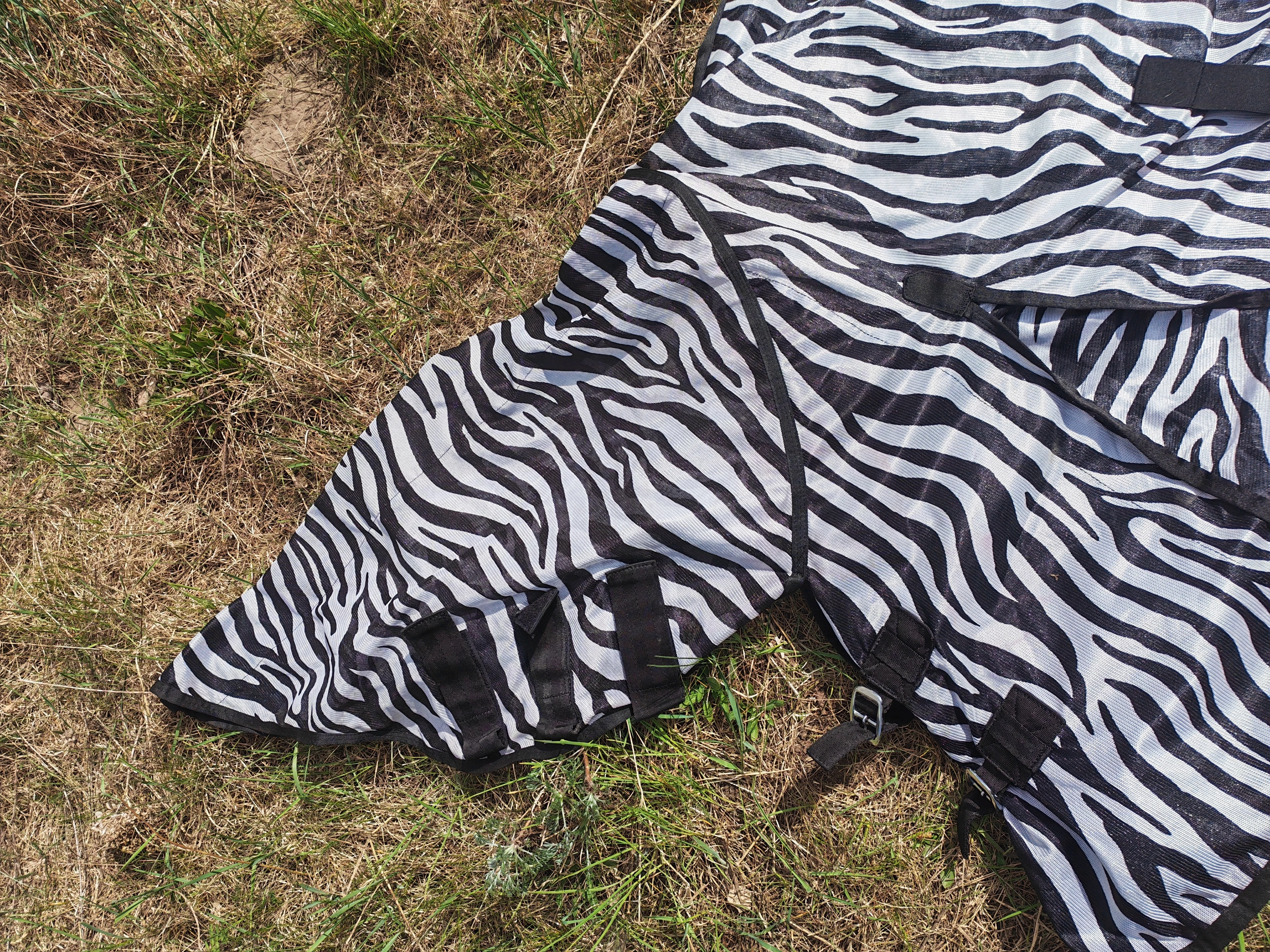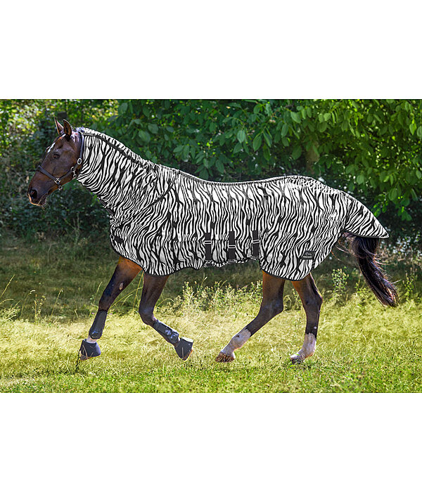 Funkcjonalna, zakrywająca całą szyję derka wykonany z lekkiej i oddychającej siateczki z nadrukiem w zebrę, chroniący przed uciążliwymi muchami. Obszerny kołnierz z trzema solidnymi rzepami i elastyczną pętelką do przymocowania do kantara. Regulowane podwójne zapięcie na klatce piersiowej i obszerna, regulowana klapa na brzuch (z elastycznymi paskami) zapewniają indywidualne dopasowanie. Optymalny komfort i swobodę ruchów zapewniają obszerny klin oraz gładka, przyjazna dla futra podszewka w okolicach ramion i ogona. Duża klapa na ogon i ściągacz.